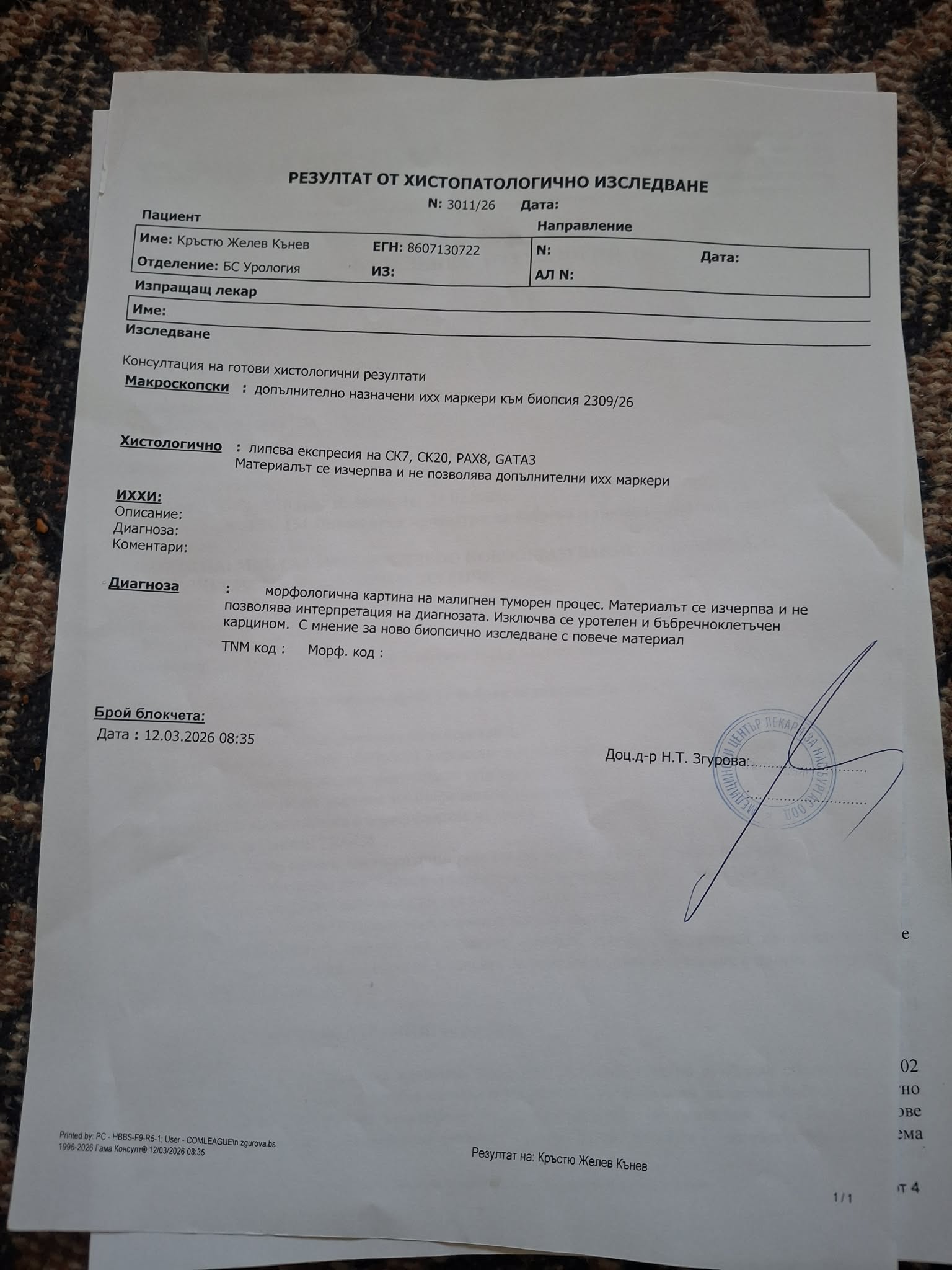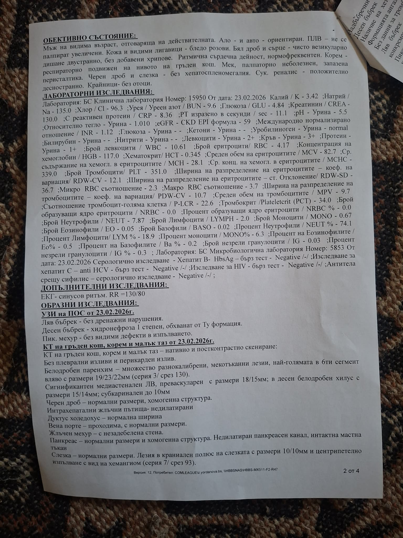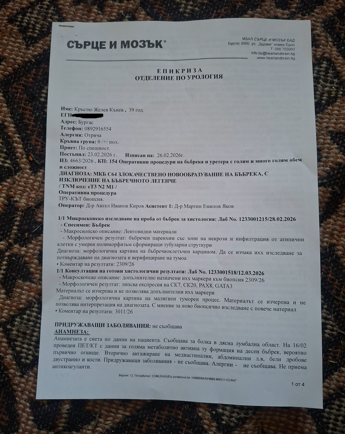 Тумора на десния бъбрек е с множество вторични белодробни и костни метастази.